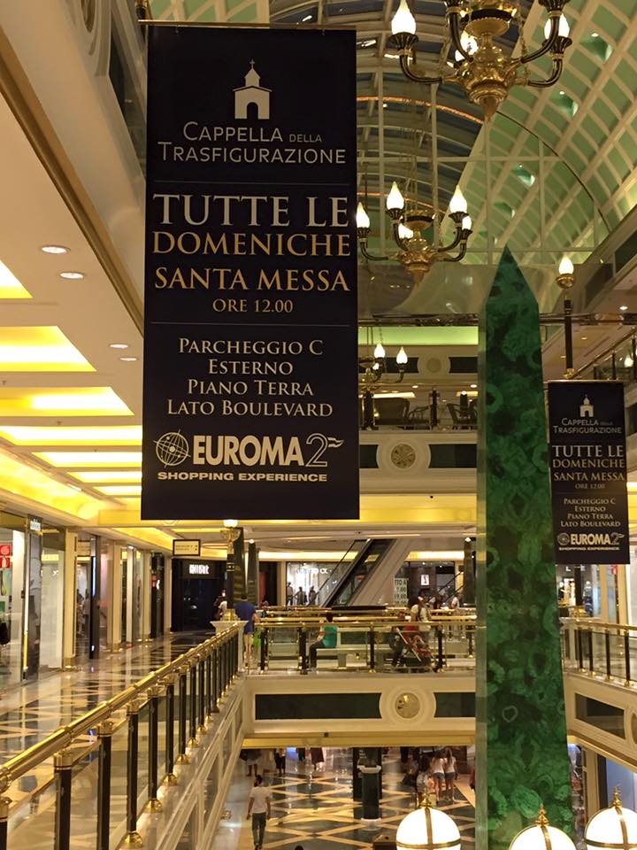 In un noto centro commerciale romano campeggiano questi manifesti. La chiesa cede del tutto al dio denaro, oppure viene saggiamente incontro al mondo e alle sue esigenze? La questione è intrigante e complessa. La si può affrontare da lontano, riflettendo sulla scia di Benjamin o Agamben, sull´origine e la natura “religiosa” del capitalismo e della “oikonomia”. Oppure sulle strategie sempre più comunicative e di vero e proprio marketing messe in campo dalle religioni per essere sul “mercato” e sapersi vendere. Da un lato è sempre forte e viva la tradizione del comandamento divino che impone di “santificare le feste”, per cui ad esempio la chiesa tedesca – molto conciliante su questioni di vita, famiglia, sessualità – non transige sulla chiusura domenicale dei negozi. E quantomeno servirebbe cautela, da parte ecclesiale, nel contaminarsi: in un bel romanzo di qualche anno fa, significativamente intitolate “Regno a venire”, Ballard descriveva le città contemporanee, soprattutto i nuovi quartieri periferici, come agglomerati di case privi di qualsiasi altro punto di incontro e di ritrovo se non i centri commerciali, che si ergono al centro di essi come nuovi templi. Dopo aver combattutto con il capitalismo contro il comunismo, la chiesa vive un nuovo grande pericolo, quello di appiattarsi sul consumismo. La vera unica grande immanente dimensione dell’uomo contemporaneo sembra quella consumistica. La sfida ineludibile, oggi, è trovare e riaffermare prospettive che riescano a trascendere questo aspetto.